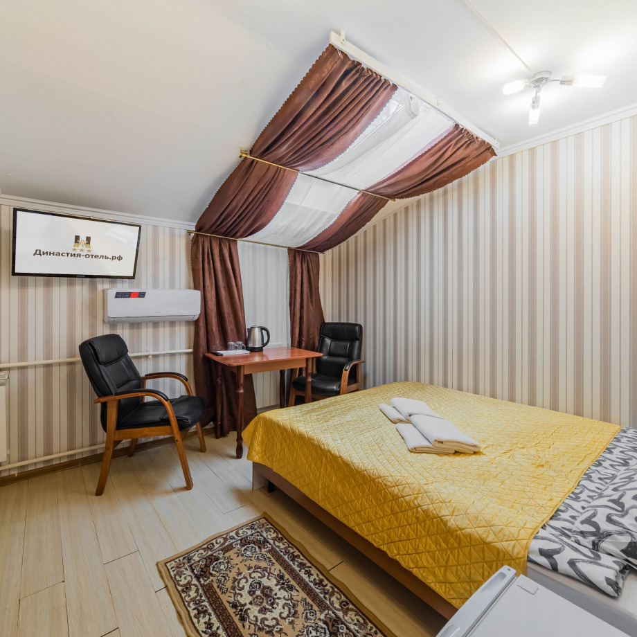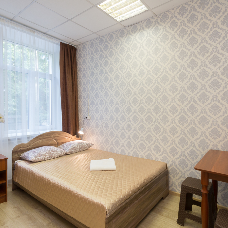 Номер с двуспальной кроватью, с собственным санузлом и душем в номере, вид из окна на парк, либо во двор. Все номера в дали от шума улиц и дорог, просыпаться вы будете под пение птиц обитающих в парке. В номере имеется кондиционер, телевизор, фен, ванные принадлежности и всё что вам необходимо для комфорного проживания! Также в нашем отеле можно покушать вкусные завтраки и ужины!