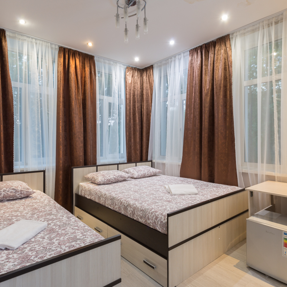 Номер для семьи с одной двуспальной кроватью и одной односпальной, с собственным санузлом и душем в номере, вид из окна на парк, либо во двор. В номере имеется кондиционер, телевизор, холодильник, фен, ванные принадлежности и всё что вам необходимо для комфорного проживания! Микроволновка имеется на каждом этаже, а на улице бесплатный настольный теннис для всех наших гостей.